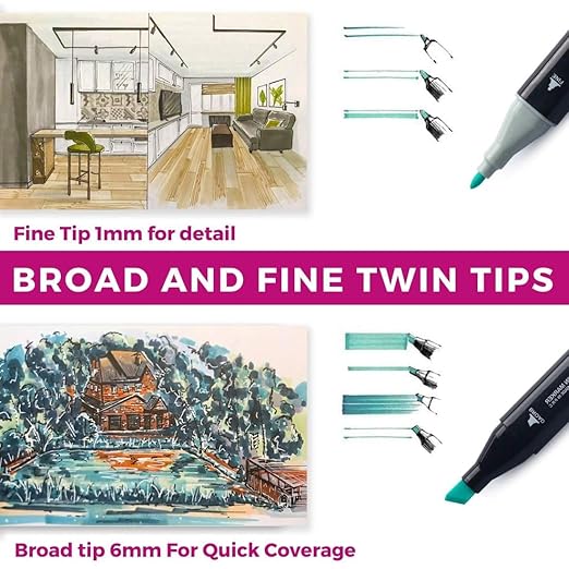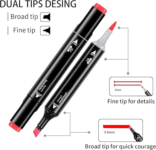 Each marker features a fine tip for detailed work and a broad chisel tip for coloring large areas – perfect for blending, shading, and highlighting. -
